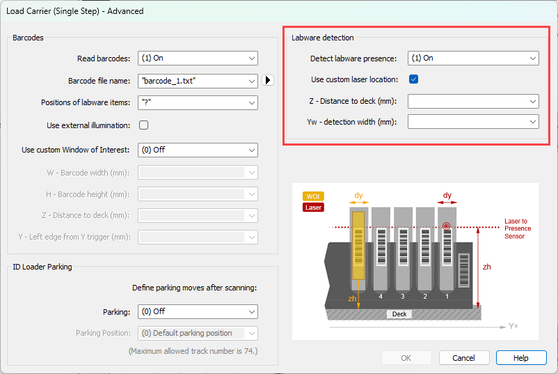 Highlighted in the red box in the image above, you have Detect set to On, check the box for a custom location, and then you pick a z-height for the laser to go to and a scan width that is applied to each site of the carrier. The help menu here can also direct you in picking acceptable values.