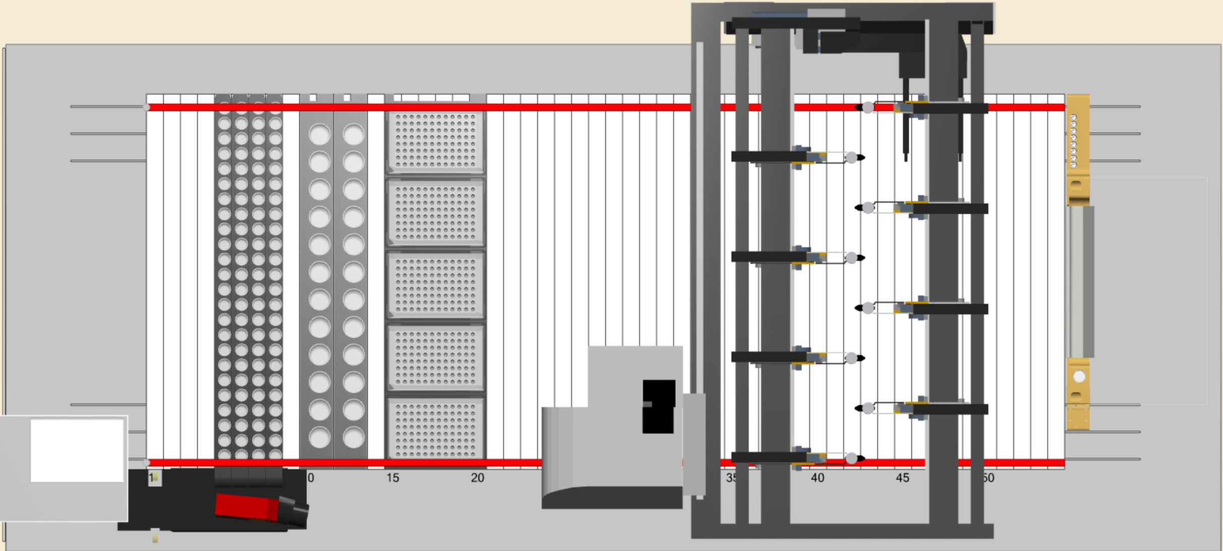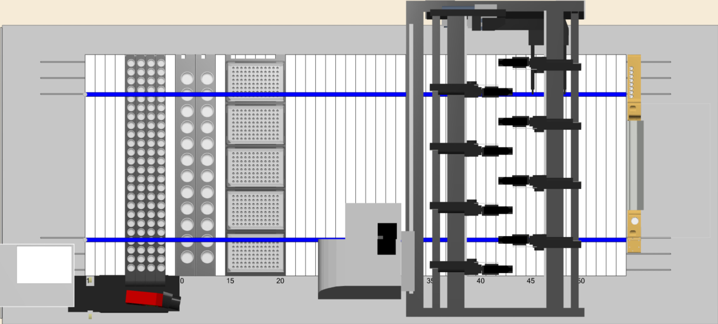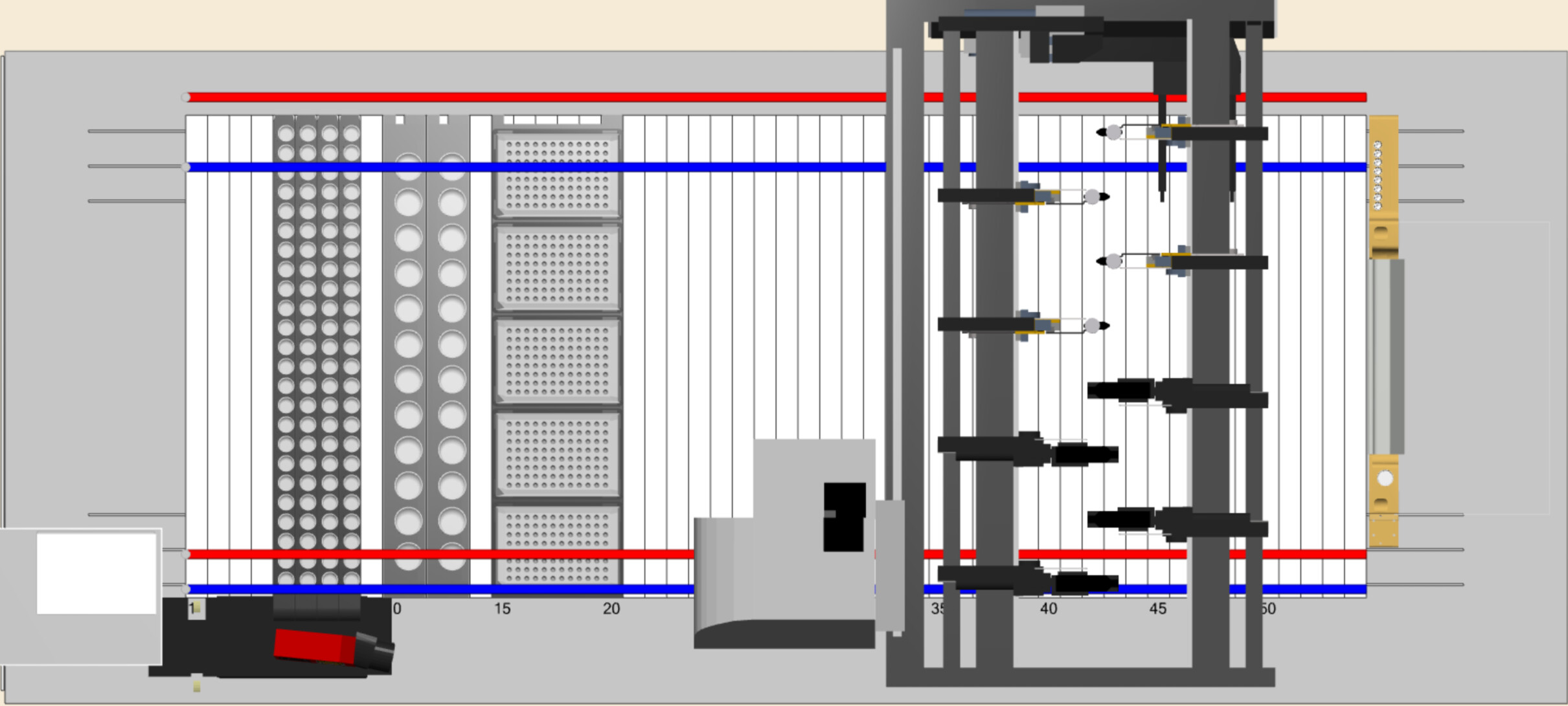 This is visualizing a STAR but the Y access is the same for STAR or Vantage. The red lines are 1mL channels and the blue lines are 5mL channels. Everywhere in between each line color is accessible by all channels of that type. Outside that region is where certain channels can no longer reach.