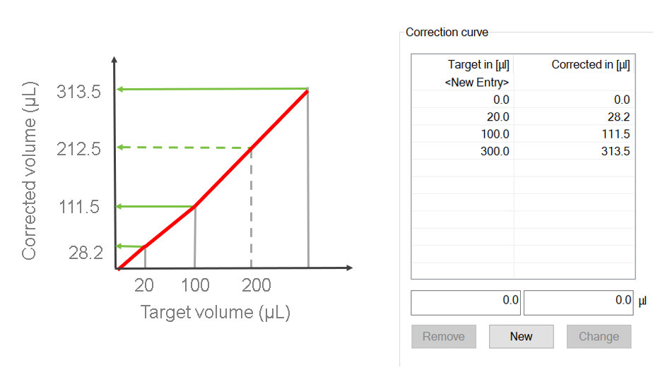 As to your second question, if you don’t have a target volume specified on your correction curve, then its corrected volume would be interpolated between points on the curve. Refer to the example below where 200uL is not set with a corrected value on the curve. If you used this liquid class during runtime and transferred 200uL, its corrected value would be interpolated to be 212.5.