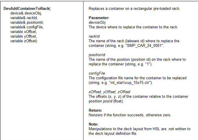 I tried to add containers at runtime using the “DevAddContainerToRack” of HSLDevLib library. But the return of the function is 0. The description says “Replaces a container on a rectangular pre-loaded rack.”