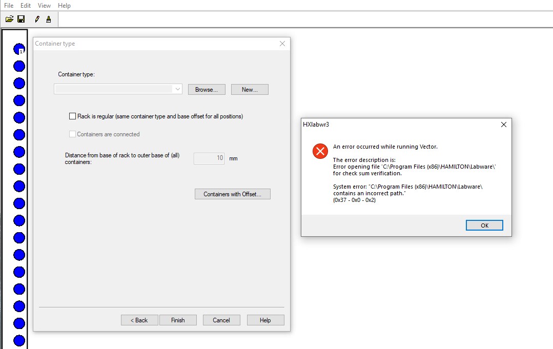 Since I only add the rack and container files to the deck at runtime, I would like to create the rack file without predefined containers. When I save the rack file, I get the following error, but the file is saved anyway.