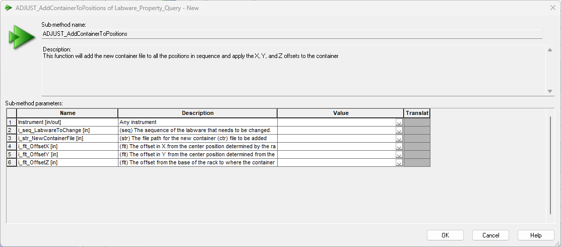 The ADJUST_AddContainerToPositions function from Labware_Prooperty_Query will query the X,Y, and Z offsets prior to adding the container to the sequence positions and apply the offset in addition to what the labware definition is using. For example: If the base offset = 10 mm and you use a Z offset of -1 in the parameters, it will change the base offset to 9 mm.