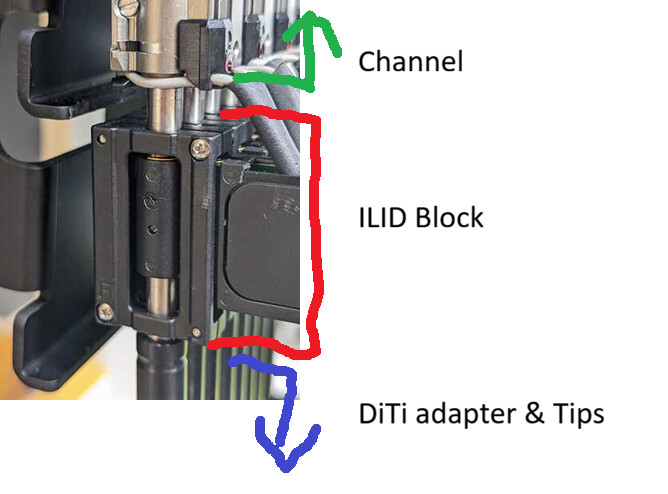The box I was talking about is the ILID block - it consists of an ILID board (in the flag-shaped compartment hanging off the side of the block) and a DiTi Sensor, which is the open box shaped device surrounding the channel, with screws in the top-right and bottom left. You can also see a black sleeve butting against the ILID block on the bottom. When a tip is physically mounted, that sleeve moves up, and pushes against the DiTi Sensor which will then transmit a signal whether or not the sensor is triggered meaning a tip is/is not mounted.