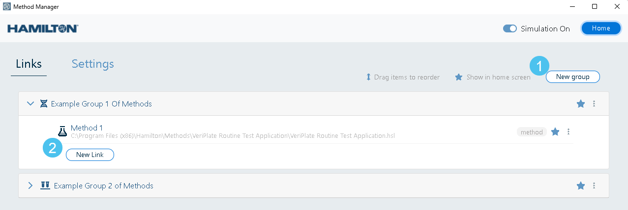 From there, in the Links tab you can create a New Group (1) and within a Group, you can create a New Link (2) to a method, file, etc.