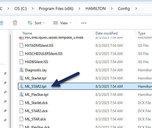Open the ML_STAR2.tpl file in the Hamilton\Config folder.