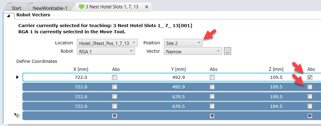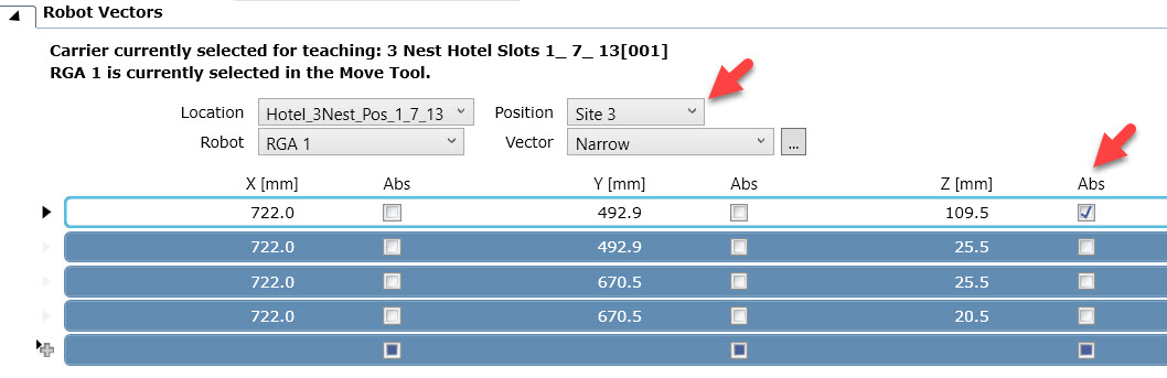 When you now select Site 1 or Site 3 for the vector, the RGA will always drive to the same safe position, which is going to be the start point from where Pathfinder calculates the next move. If the Transfer Labware was previously working for a tip box in site 2, it should now also work for a box in site 3 as the start position for the upcoming Pathfinder move is the same.