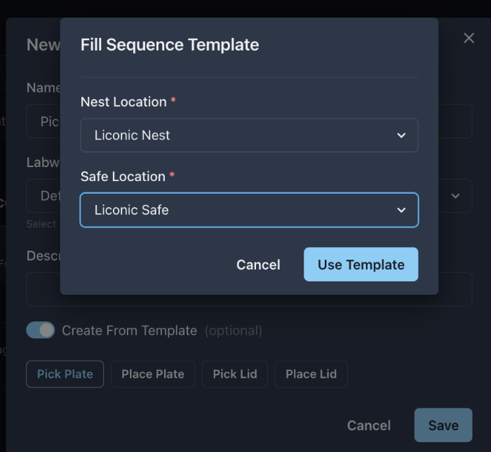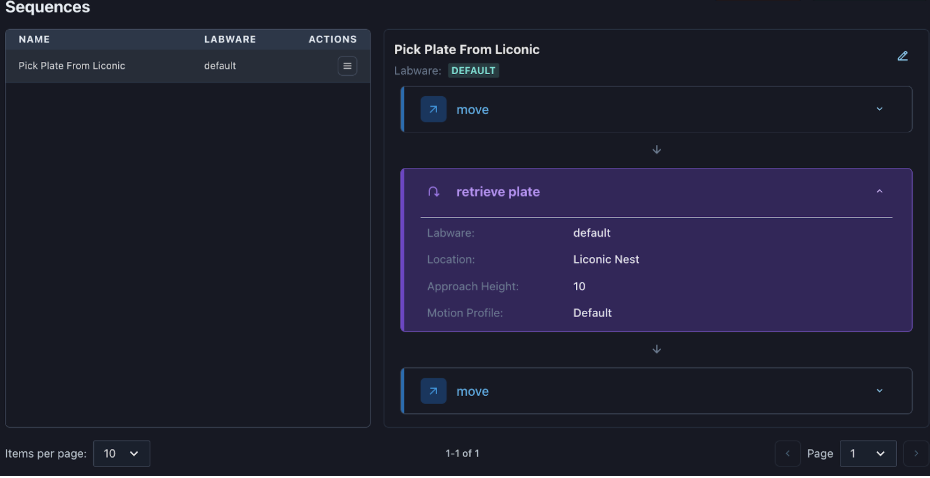 - Automated sequence generator. We have templates for the most basic tasks such as pick, place, lidding and delidding sequences that integrate with Galago’s labware model.