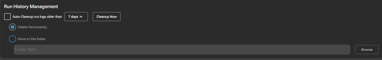 In VENUS 6, under Settings > General, there is an option for Run History Management, which handles automatic clean up of the LogFiles folder. Options include “files older than” timespan, and whether to delete the files or move them to a new folder: