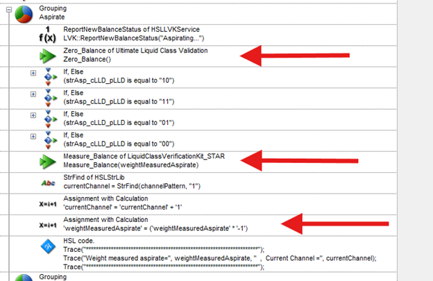 Within the Pipette_1mLChannels submethod, add a Zero_Balance before the aspirate and a Measure_Balance after aspirate. Assign a new variable (weightMeasuredAspirate). Make sure to multiply by -1 to make it a positive value.