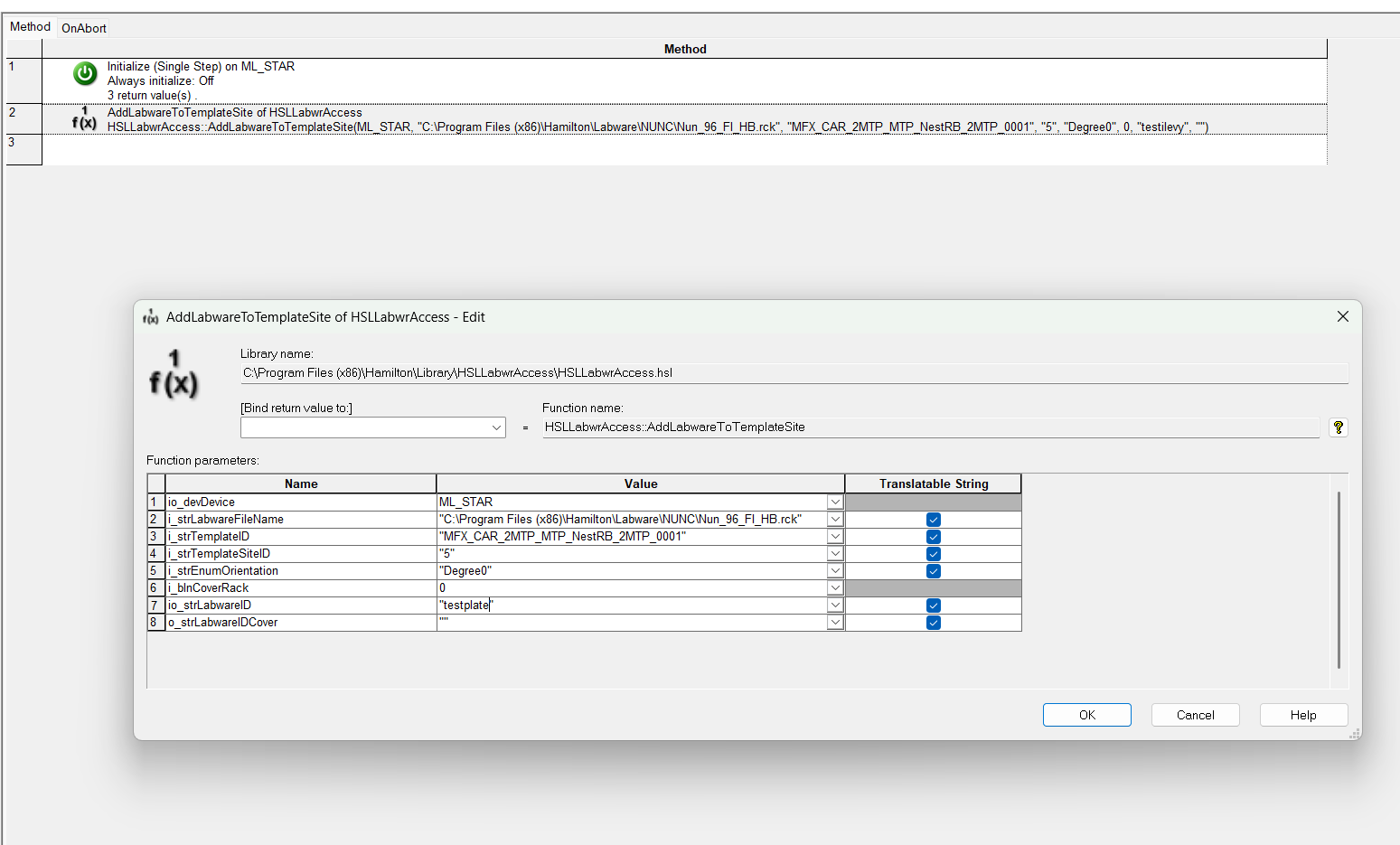 Getting back to this. I have problems with the “AddLabwareToTemplateSite”-function. I get a “cannot get template data” both on my own test method and the library’s demo method, it’s like Venus can’t access the template file or something?