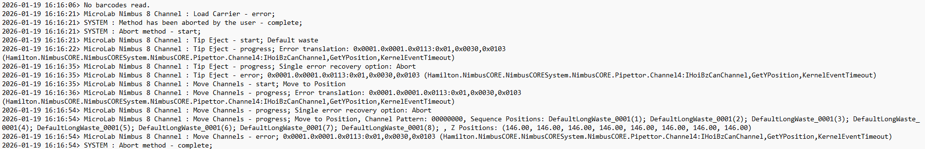We’ve had a few runs stop due to an unexpected Y-axis error. Based off of the files shown below, could this be hardware related (motor dying)? I haven’t seen the crash happen live yet, but from the description, the instrument is just performing whatever it normally would… so if its in the middle of a run, the error can occur there, it can occur during an abort sequence once a method is stopped, or just normal operation. I tried to create a move test where I just told the 8 channels to move around the deck from labware to labware, over and over in a set of loops, but was not able to catch this issue.