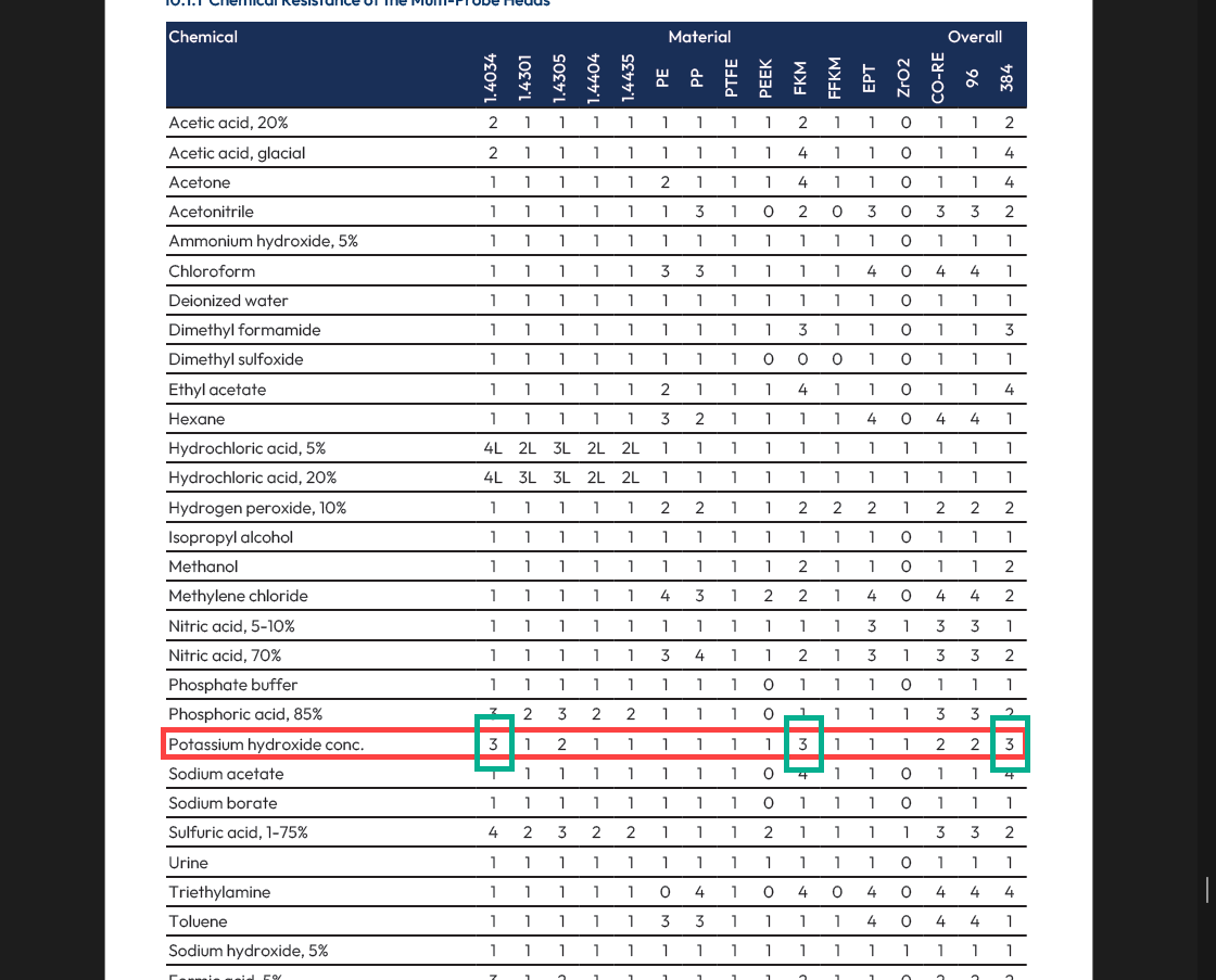 Ranked by following the guide below, concentrated KOH has values of 1 to 3 with 3’s on viton, the MPH384, and a type of steel that is not listed as part of the CO-RE channel interface.