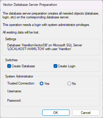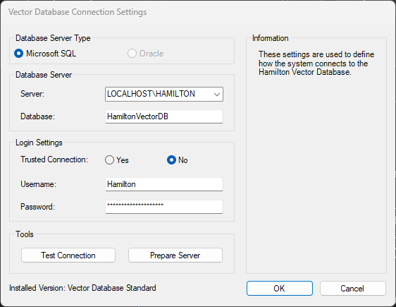 Return to the Vector Database Connection window and click on Prepare Server. In the window that pops up, leave all the defaults selected except for Trusted Connection, which should be switched to Yes. Click OK, then Yes. If the response is “The server has been successfully prepared” then Start the Hamilton.VENUS.WebAPI.Host service and perform some test runs to see if the error has cleared. If the error continues, then reach out to IT to look into other potential causes. If preparing the server fails, then continue with the following steps.