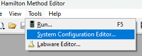 Access System Configuration Editor, either through the Tools menu of Method Editor or Run Control, or the System Tools menu of the VENUS 6 GUI