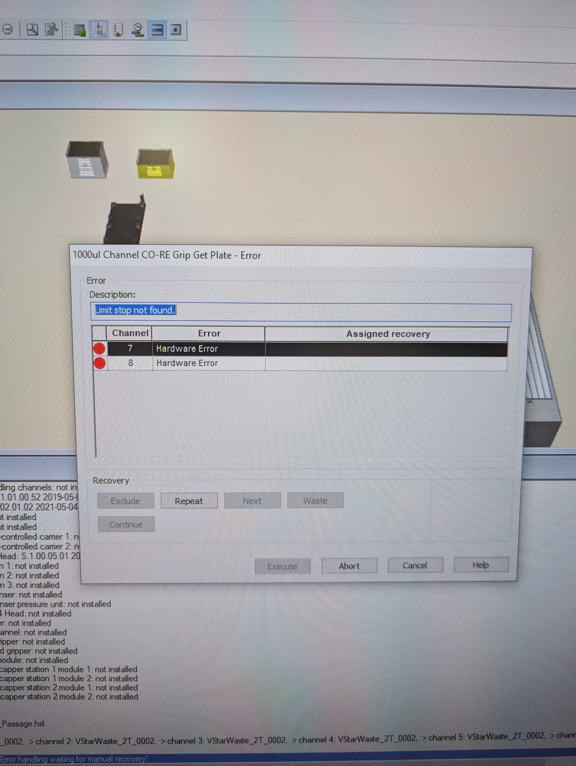 I am trying to teach this new custom Z-position, however I am looking for guidance on how best to go about this, since I cannot see where the channels are within the QCGs to understand if I am too high or too low. When attempting QCG pickup, the channels enter smoothly, but no squeeze drives seem to activate, and the system stops to display the error below (limit stop not found).