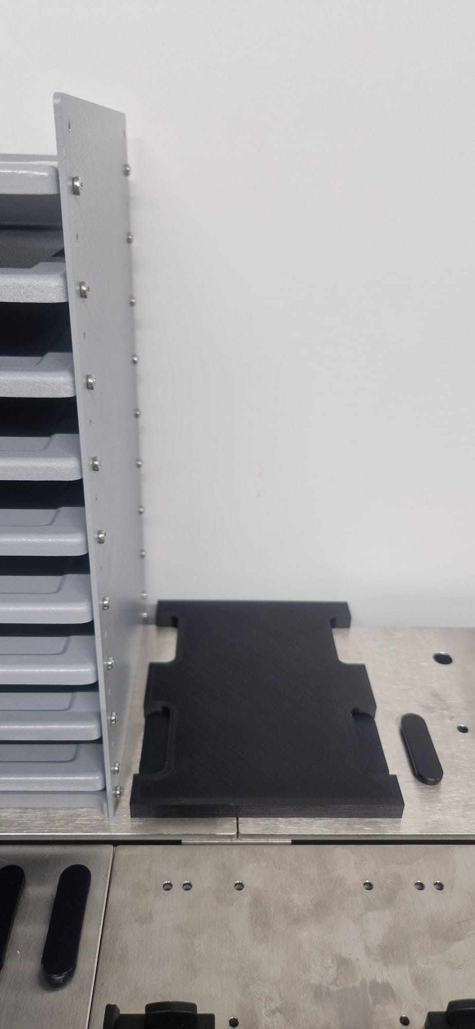 I had trouble printing the above model, probably because the (FDM) printer wasn’t ideal. To make it easy to iterate on the design, I wrote a version in OpenSCAD. I haven’t printed it yet, but I did have a variation CNC machined (see custom-tecan-fluent-nest). You can find the OpenSCAD script here. The protrusions probably make it a bit tricky to print; if I would go ahead, I’d replace them with holes, press in threaded brass inserts (example), and secure everything with screws.
