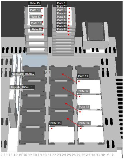 I need the RGA to move 4 plates from 3rd column of nests to the 2nd column of nests so that the air FCA can access them for pipetting (see image). I tried using the Transfer Labware command but was receiving the error “Target position of arm RGA out of range.” The RGA should be able to move plates between 7mm nests in multiple orientations, so I’m not sure why it’s not using the NR grip to do so. I checked the site definitions for the 7mm nest and base plate (6 landscape 7mm nest) and both have NR selected as a grip option.