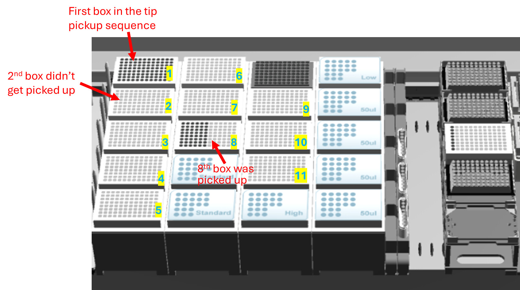 I am trying to use the tip adapter for the CORE96 head to pick up tips by columns on ML_STAR, but have run into an issue. After the first tip box was used, the system did not proceed to the next box as expected. Instead, it skipped ahead and picked up tips from a box several positions later (about 6 boxes ahead). Additionally, the tip counter indicated that all the intermediate tips were used, even though they were not physically picked up. Does anyone know what might have caused this issue and how to fix it?
