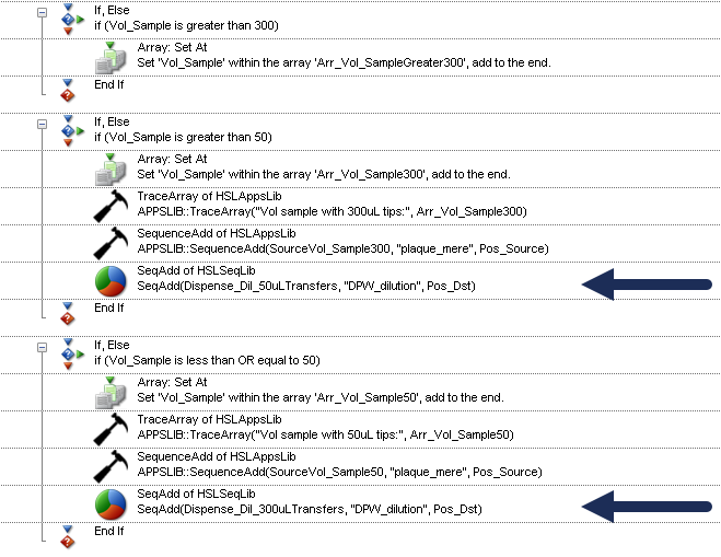 In your method, it appears that you’re using one sequence “DPW_diluant1” for all the dispense steps. My recommendation would be to build a sequence for the transfers using 50uL tips, and a sequence for the transfers using 300uL tips when you are building the arrays.