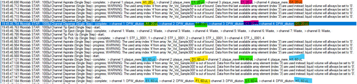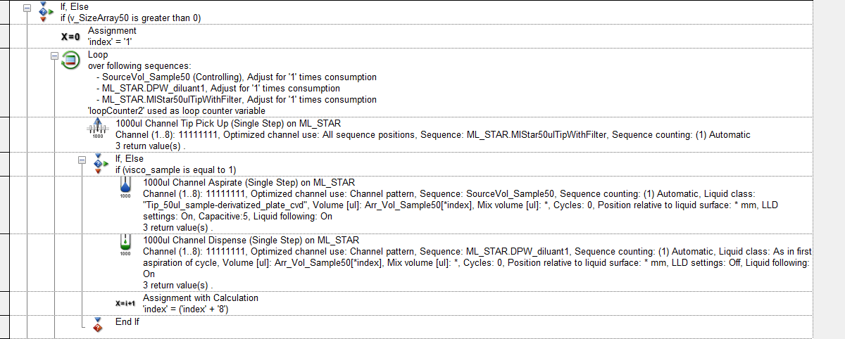 Thank you for your help. I have added my method and the Excel file I use for this sequence. Their names are: 260218_amino_acids.pkg and the Excel file is :Template_amino_acid. Actually, I don’t understand how to retrieve the initial volume indexes so that I can put them back in order when dispensing. I saw that you use scans in the exercises, but this gets mixed up with the index blocks. Thank you in advance for your help.