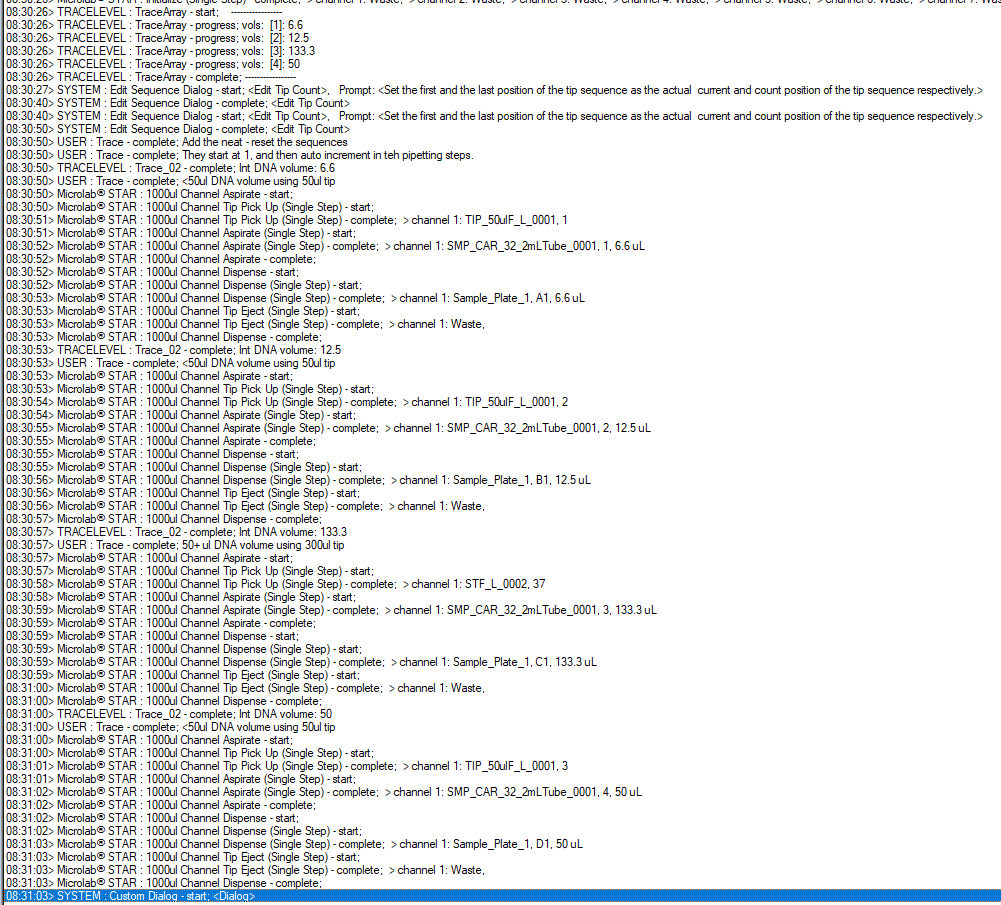 @Darren Your dispense sequence should have a sequence created during the “Sequence Add” (back when the script was reading through the file). This means depending on where you’re pipetting from (for example, another 96 well plate) you will have 2 Seq Add statements: