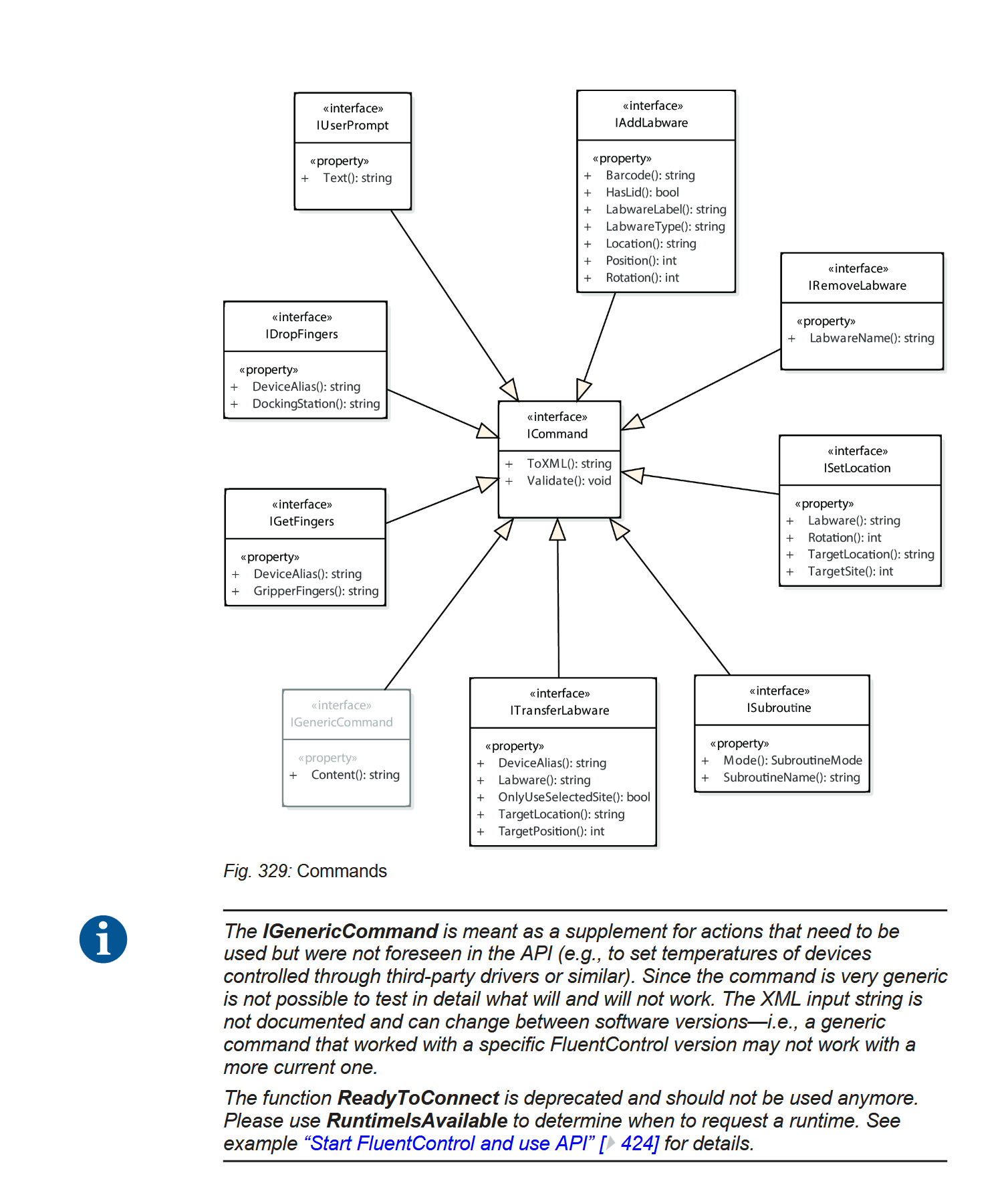 I currently use the GenericCommand interface to send almost any command that can be run directly from a FC script or method. First you make a script with the command you want to run through the API, save the script, and then you inspect the XML in the relevant script, which is usually (always?) saved in a .XSCR file in C:\ProgramData\Tecan\VisionX\DataBase.