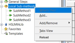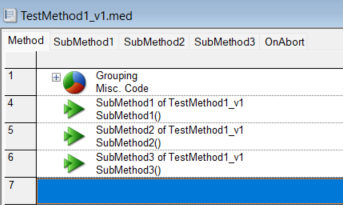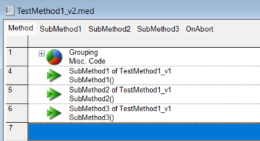 There is a graphical glitch in the Venus 4 method editor that displays incorrect sub-method names. After saving a .med file with āSave Asā¦ā and changing the file name, the sub-method calls are still displayed with the previous name. This persists after closing and reopening as well as saving again. See the example below where I saved āTestMethod1_v1.medā as āTestMethod1_v2.medā: