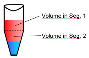 The liquid is only in the conical part (segment 2) of the tube. Only the geometry of segment two (the conical shape) will be taken into account for the calculation of the liquid following speed. The speed is calculated from the height of the amount of liquid that will be removed.
